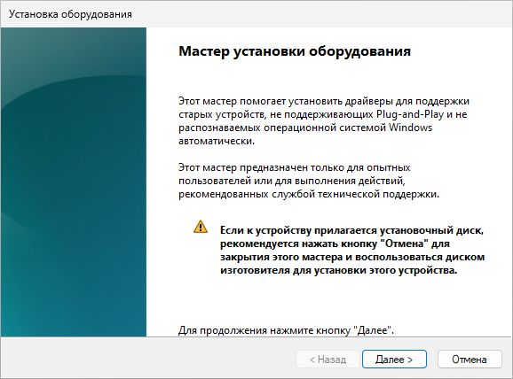 2. В открывшемся окне «Мастер установки оборудования» нажимаем на кнопку «Далее».