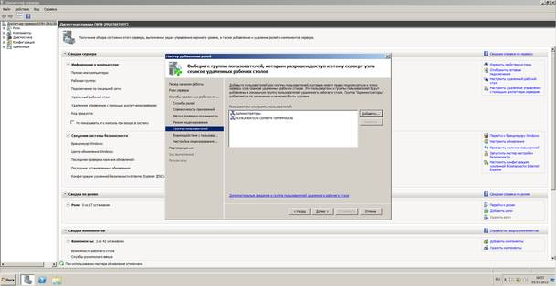 Группы пользователей. Здесь вы можете сразу указать группы или отдельных пользователей, которым будет разрешен доступ к серверу терминалов. Это можно будет сделать и позднее, просто добавив