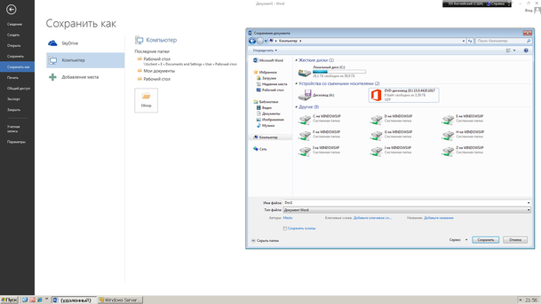 Запуск Word 2013 происходит теперь так же, как и обычное локальное приложение. Скорость запуска в пределах 2-3 секунд, что программ Microsoft нормально. И нам доступны диски как виртуальной, так и физической машин.